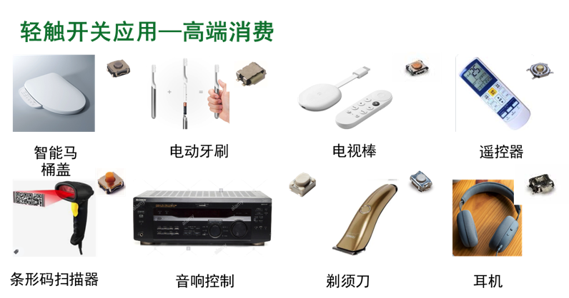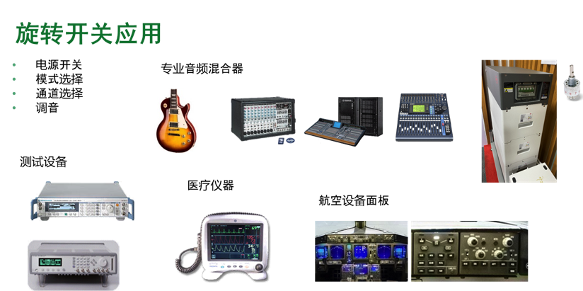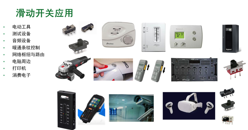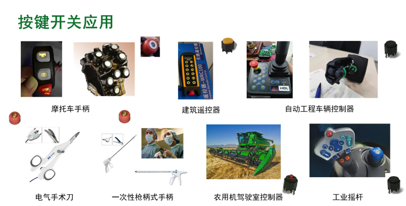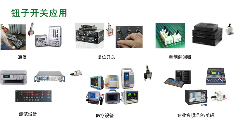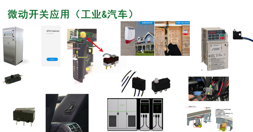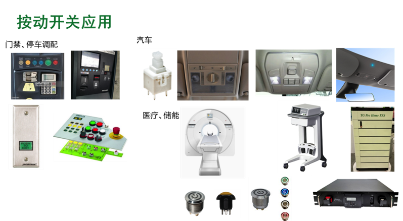 豐富的開關(guān)產(chǎn)品系列,保護(hù)輕觸開關(guān)、按鍵開關(guān)、鈕子開關(guān)、按動(dòng)開關(guān)、探測(cè)開關(guān)、滑動(dòng)開關(guān)、撥碼開關(guān)、微動(dòng)開關(guān)、翹板開關(guān)、旋轉(zhuǎn)開關(guān)、導(dǎo)航開關(guān)、鑰匙開關(guān)、指輪開關(guān)等。該開關(guān)大多數(shù)需要人為干預(yù)觸發(fā)或執(zhí)行開關(guān)動(dòng)作,與半導(dǎo)體電子開關(guān)(MOSFET/IGBT/Thyristor等)等具有一定程度上的互補(bǔ)與競(jìng)爭(zhēng)關(guān)系,半導(dǎo)體開關(guān)需要有驅(qū)動(dòng)控制信號(hào)來控制開關(guān),在控制回路斷電時(shí),開關(guān)功能即失效,機(jī)械結(jié)構(gòu)具備人為干預(yù)操作,因此在安全與可靠性要求高的領(lǐng)域具有不可替代性。同時(shí)為了提高體驗(yàn)感,半導(dǎo)體開關(guān)與機(jī)電開關(guān)結(jié)合也很常見,比如電動(dòng)汽車門窗開關(guān)。